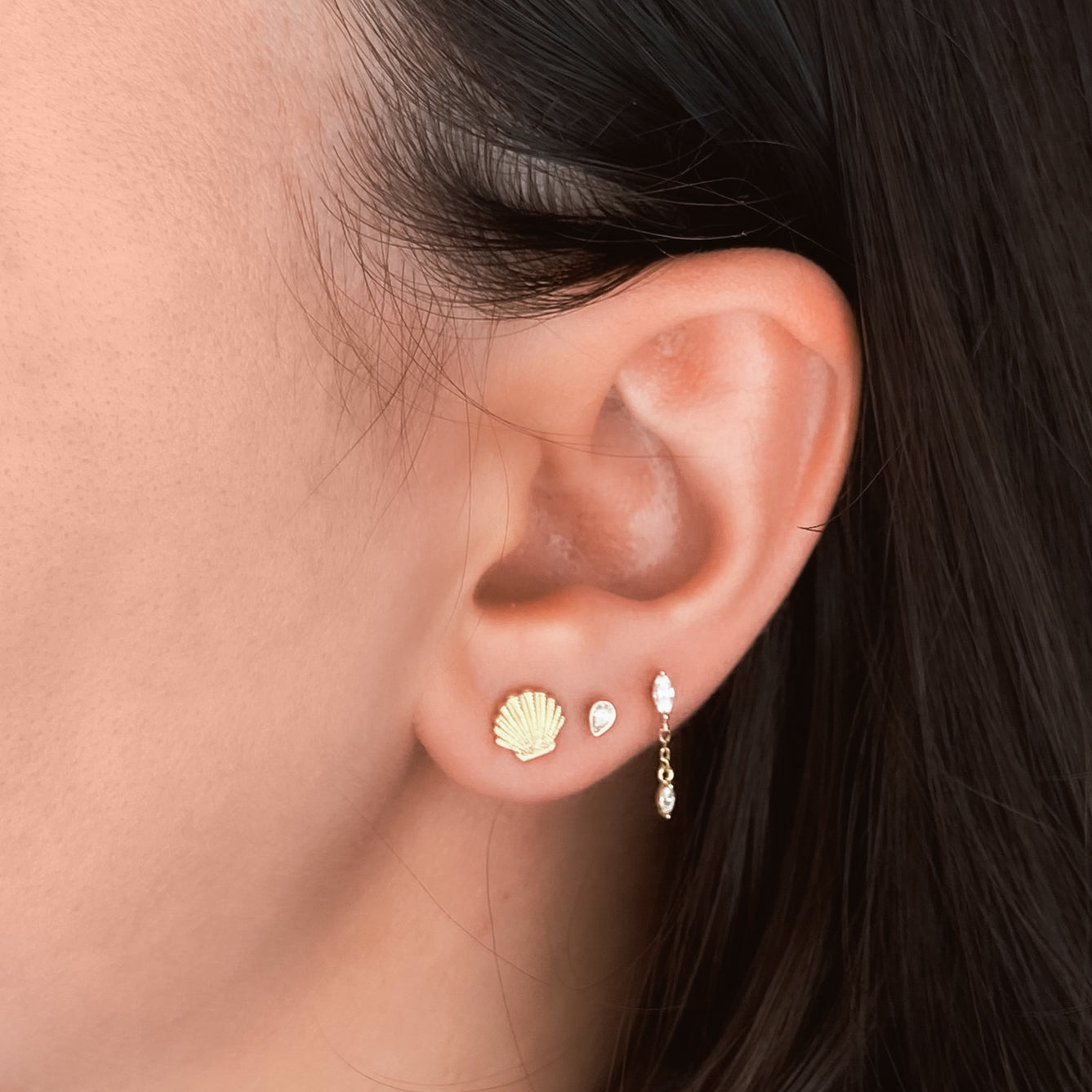Two marquis-cut crystals sway from a whisper-fine 14k gold link, catching light like sparks in the dark. The 18 G threaded flat-back post slides in from behind and screws closed at the front for a secure, sleep-proof fit—no tangles, no snags, just a weightless swing you barely feel but everyone notices.