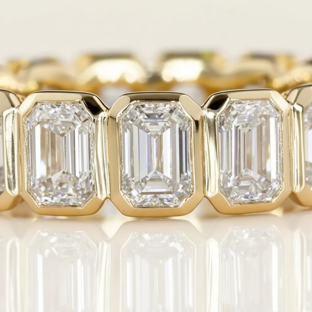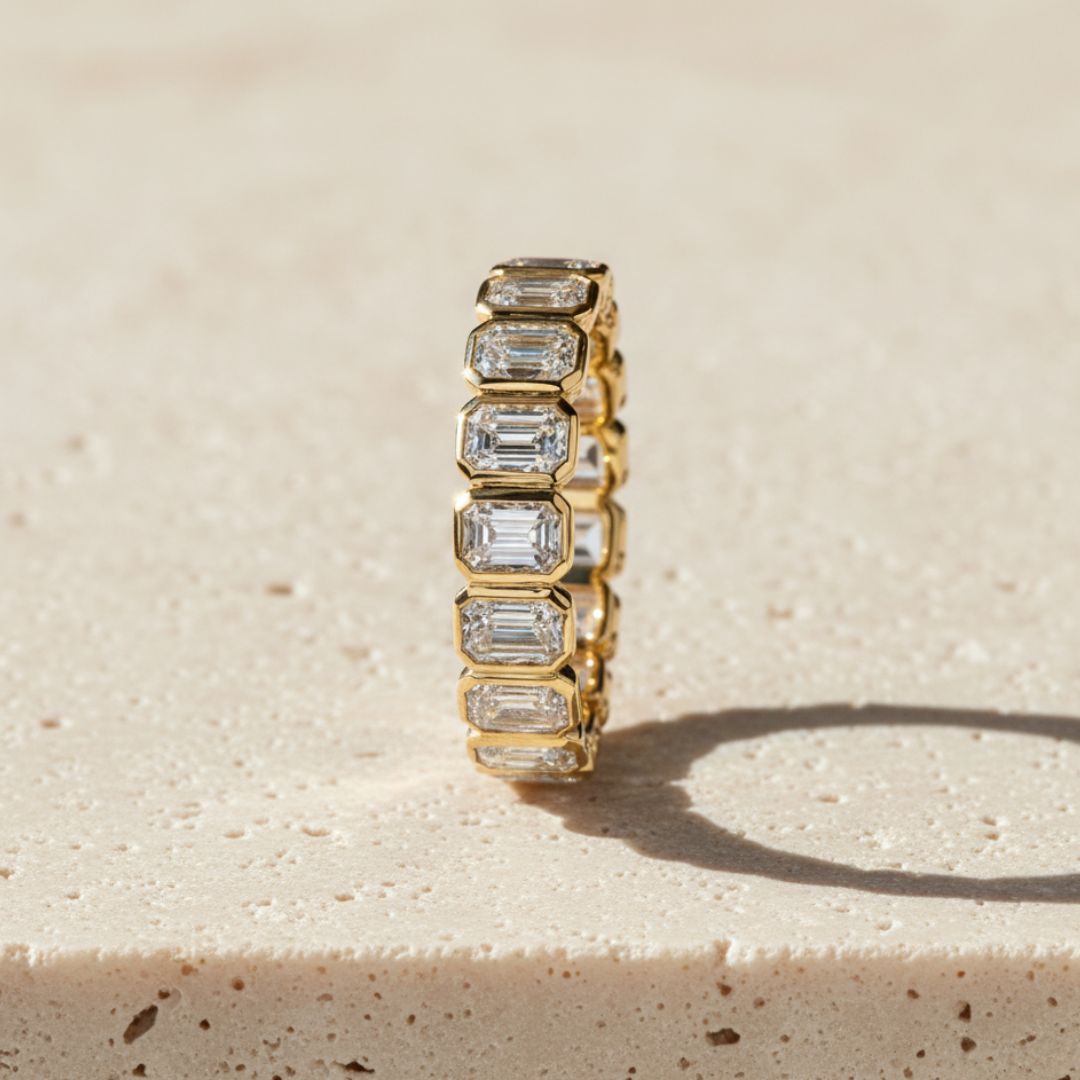 Inspired by architectural grace and enduring strength, The Column Band reimagines the eternity ring as a study in structure and light. Each emerald-cut lab-grown diamond — 3 carats total (varies depending on size) — is framed in a sleek bezel of 14k yellow gold, set north–south for a bold, elongating silhouette.