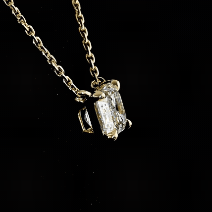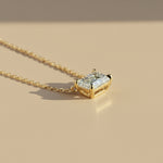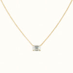 Crafted with intention, The Horizon Pendant reimagines the classic solitaire as a study in light and line. A 1.00ct emerald-cut lab-grown diamond is set east–west, suspended between fine gold chains so it rests elegantly across the collarbone in a barely-there setting - almost floating. Minimal corner prongs secure the stone while keeping its geometry clean and unobstructed.