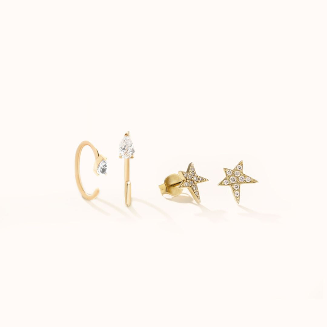 Wear the Supernovas in the first lobe for a crisp, celestial accent, and the Diamond Drop Crescents for movement and edge. Layer with a thin hoop to finish the constellation.