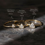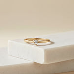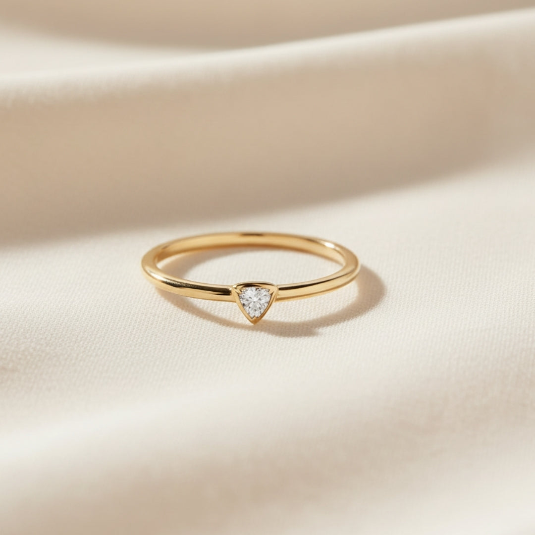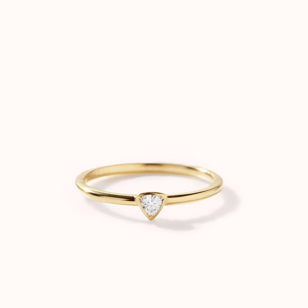 A sleek flash of geometry, scaled for everyday glamour. The Mini Trillion Stacker showcases a petite trillion-cut lab-grown diamond nestled in a precise bezel setting atop a slender solid gold band. Sharp angles meet soft minimalism—strike it solo or layer it for a sculptural stack with subtle edge.