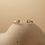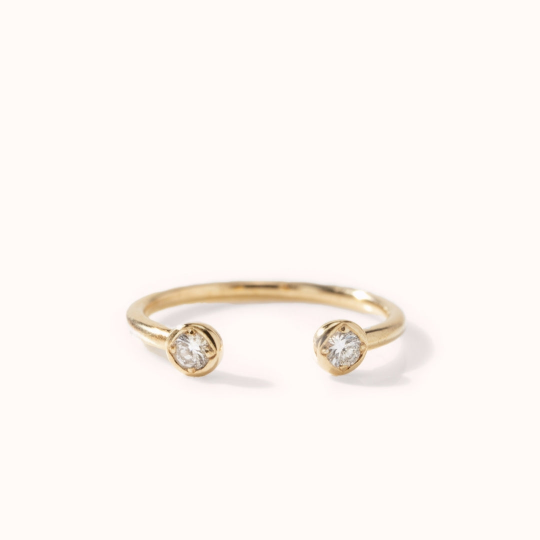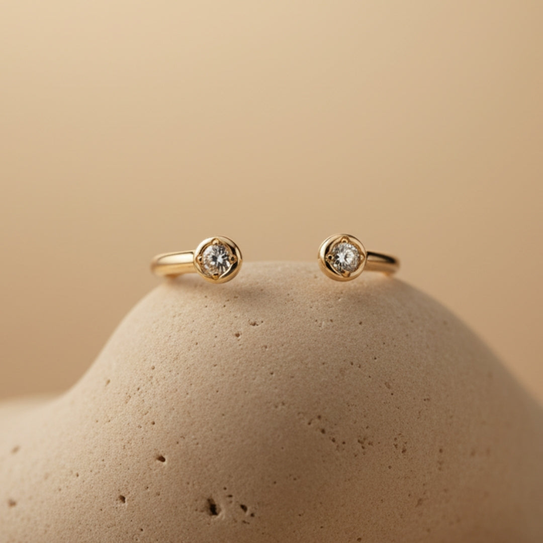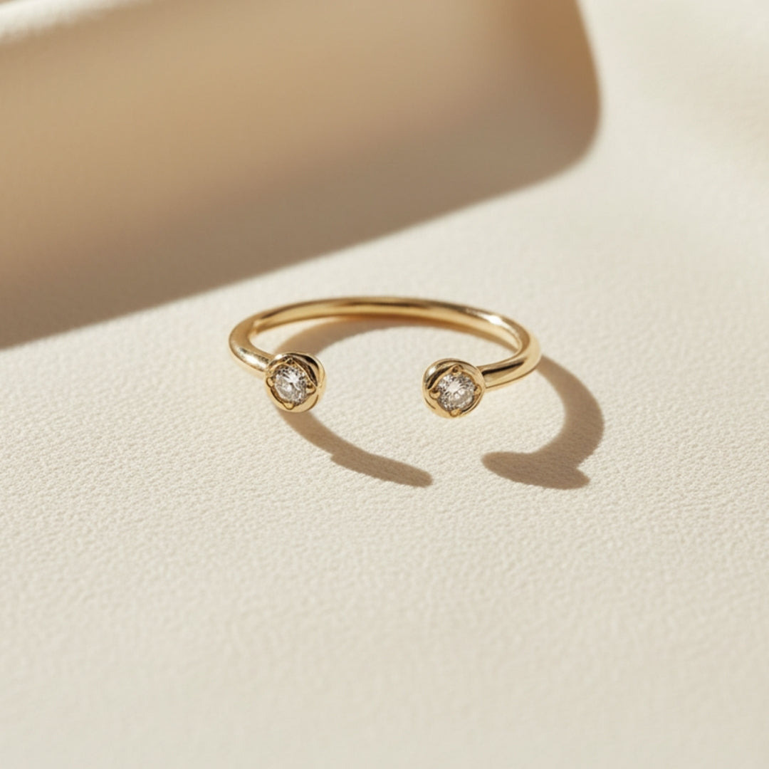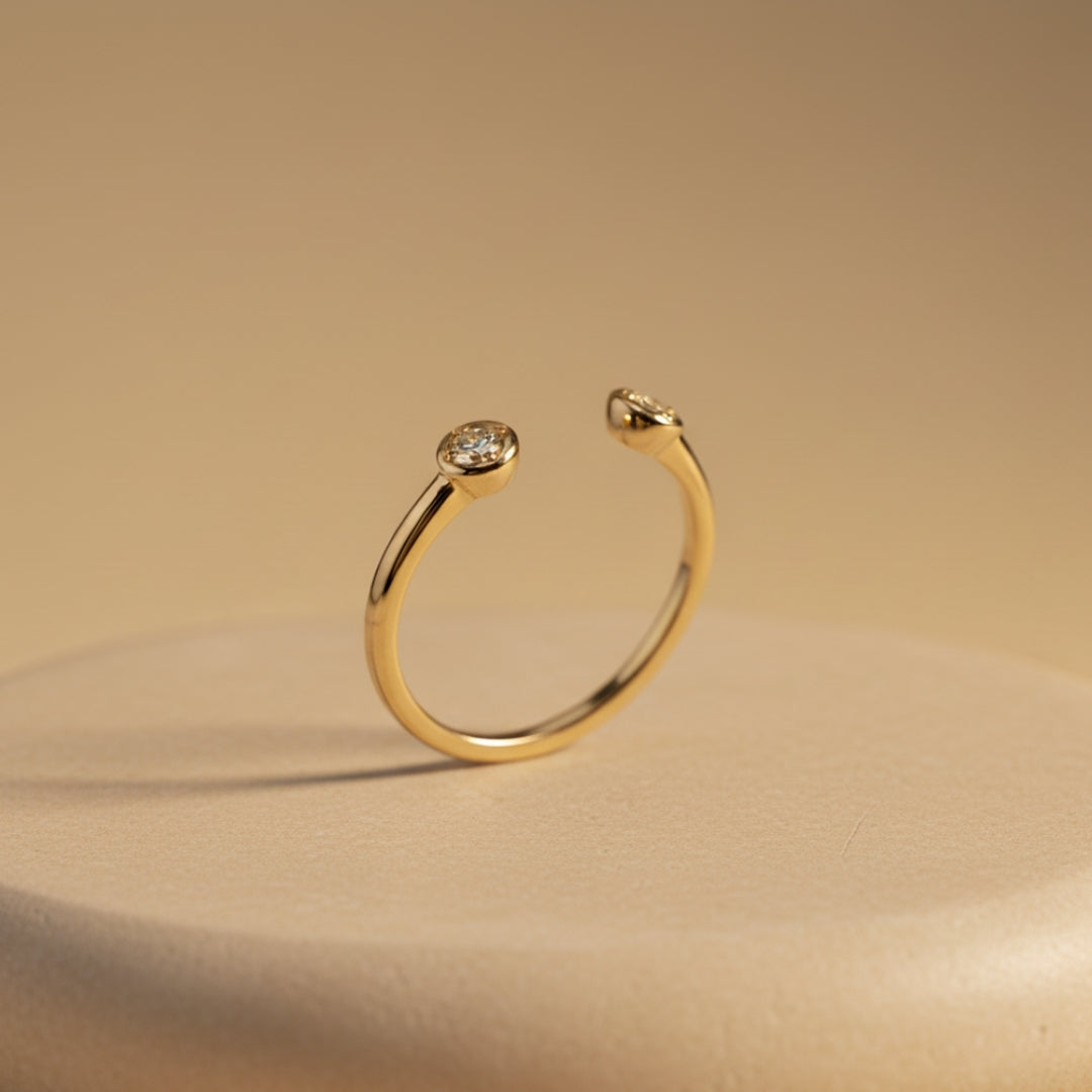 The Open Cuff Ring is where minimalism meets modern elegance. Crafted in 14k solid gold, it features two bezel-set lab-grown diamonds that create a sophisticated yet approachable design. Perfect for stacking or wearing solo, this adjustable ring offers a sleek, understated sparkle for any occasion.