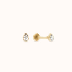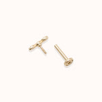 Delicate, fluid, and made to move with you. The Willow Stud features three round precision-cut crystals, each cradled in a marquise-shaped bezel of solid 14k gold. Arranged in a gentle arc, it hugs the curve of your ear like a miniature ear climber — perfect for a cartilage piercing or lobe. The threaded flat-back post (18g, 8mm) inserts from the back of the ear with a long screw top for easier placement, and stays secure without snagging.