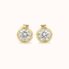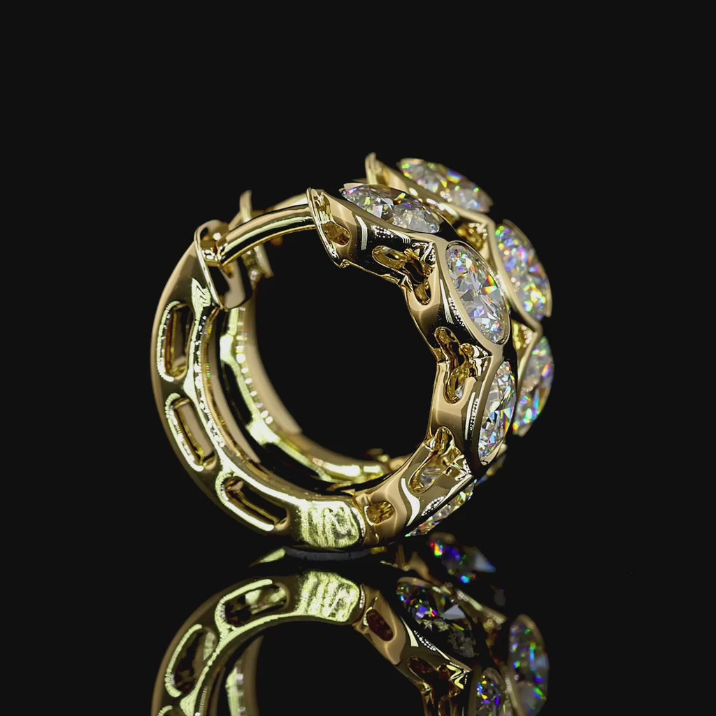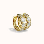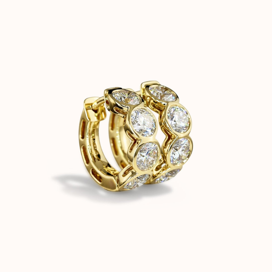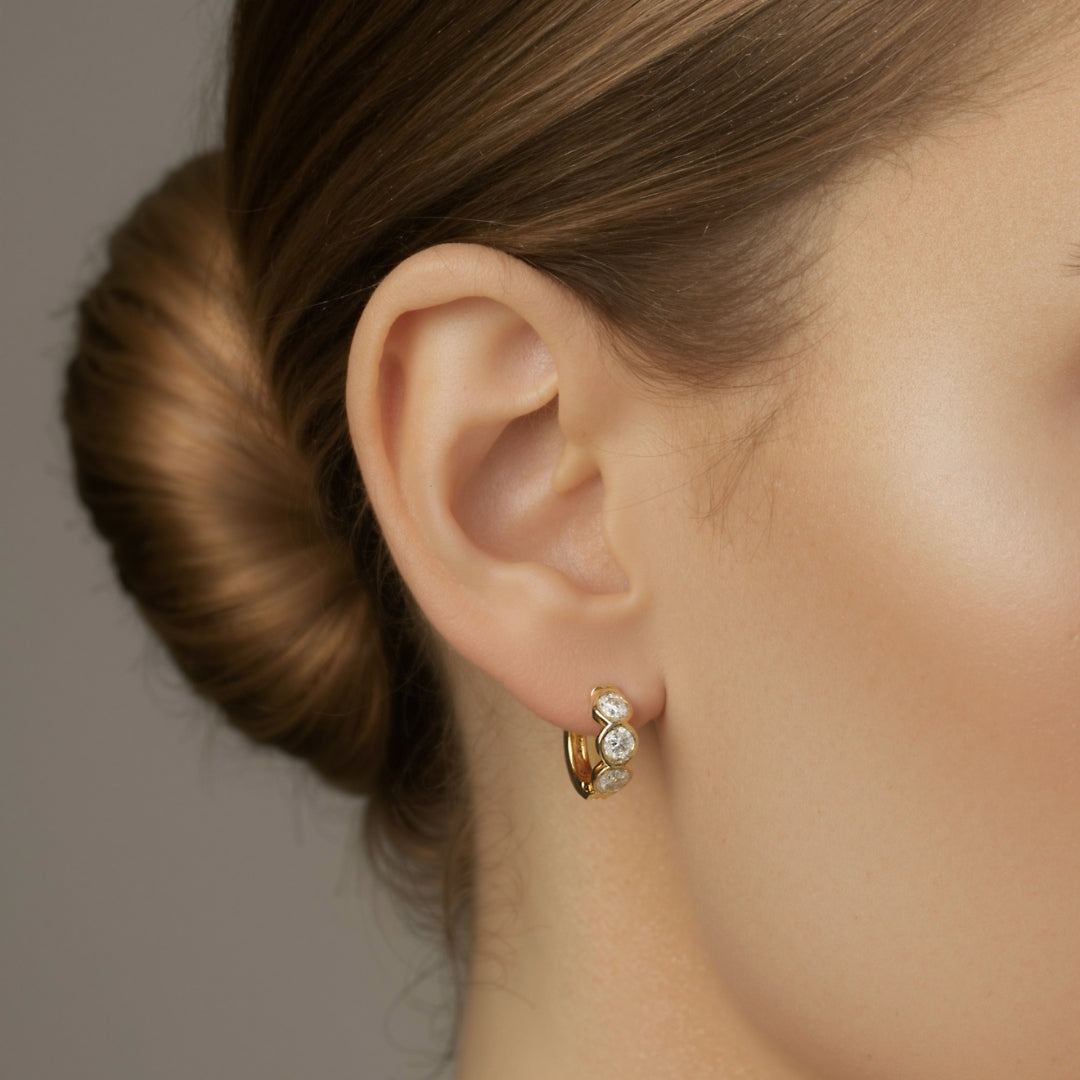 The Halo Huggies are crafted in 14k gold and set with round brilliant lab-grown diamonds framed in smooth bezels — each one reflecting the next in an unbroken rhythm of glow. Designed with intention, their 9mm silhouette hugs close, catching light from every angle without ever feeling heavy.