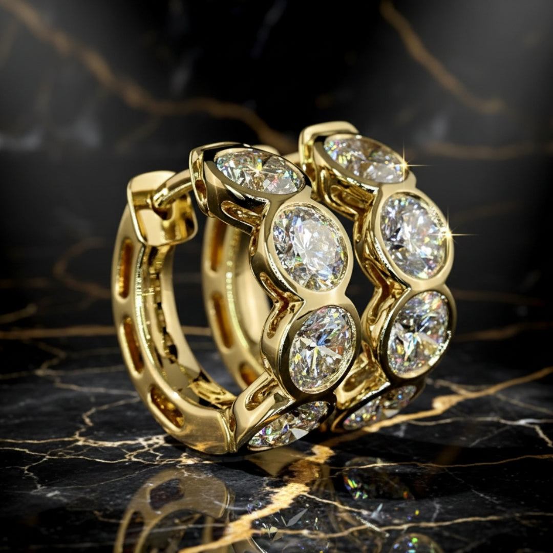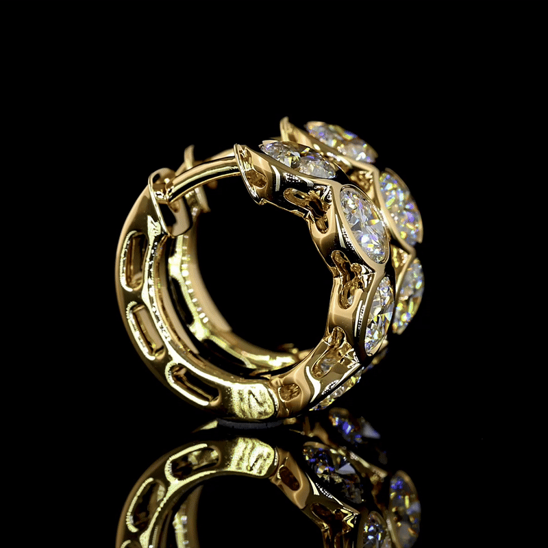 There’s a quiet power in their symmetry: balanced, sculptural, and certain. The hidden hinge keeps them seamless, while the continuous row of diamonds feels like a modern halo — luminous, grounded, and impossible to ignore.