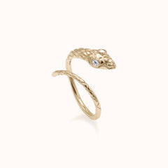 An edgy twist on classic huggies, the Golden Serpent Huggies coil around your lobe in sculptural 14k gold. Sculpted with scaled contours and finished with subtly glinting crystal eyes, they offer whispered mystique instead of loud drama. Elegant yet discreet, choose one for a curated look or two to complete the coil motif.