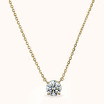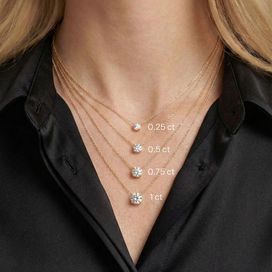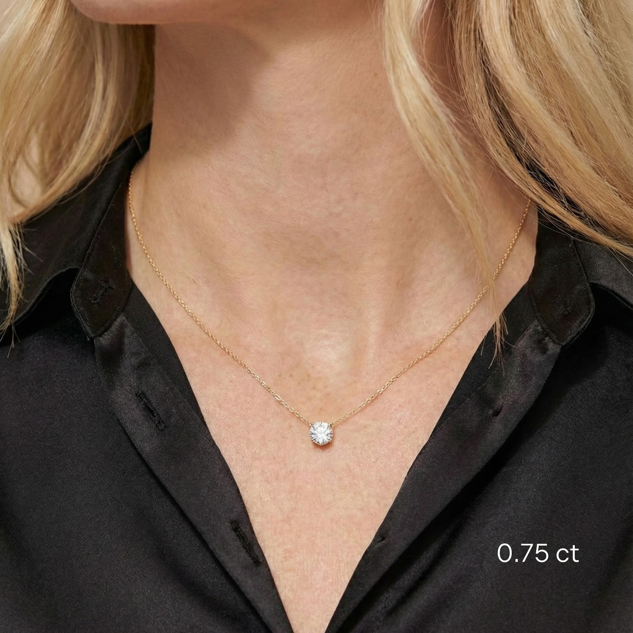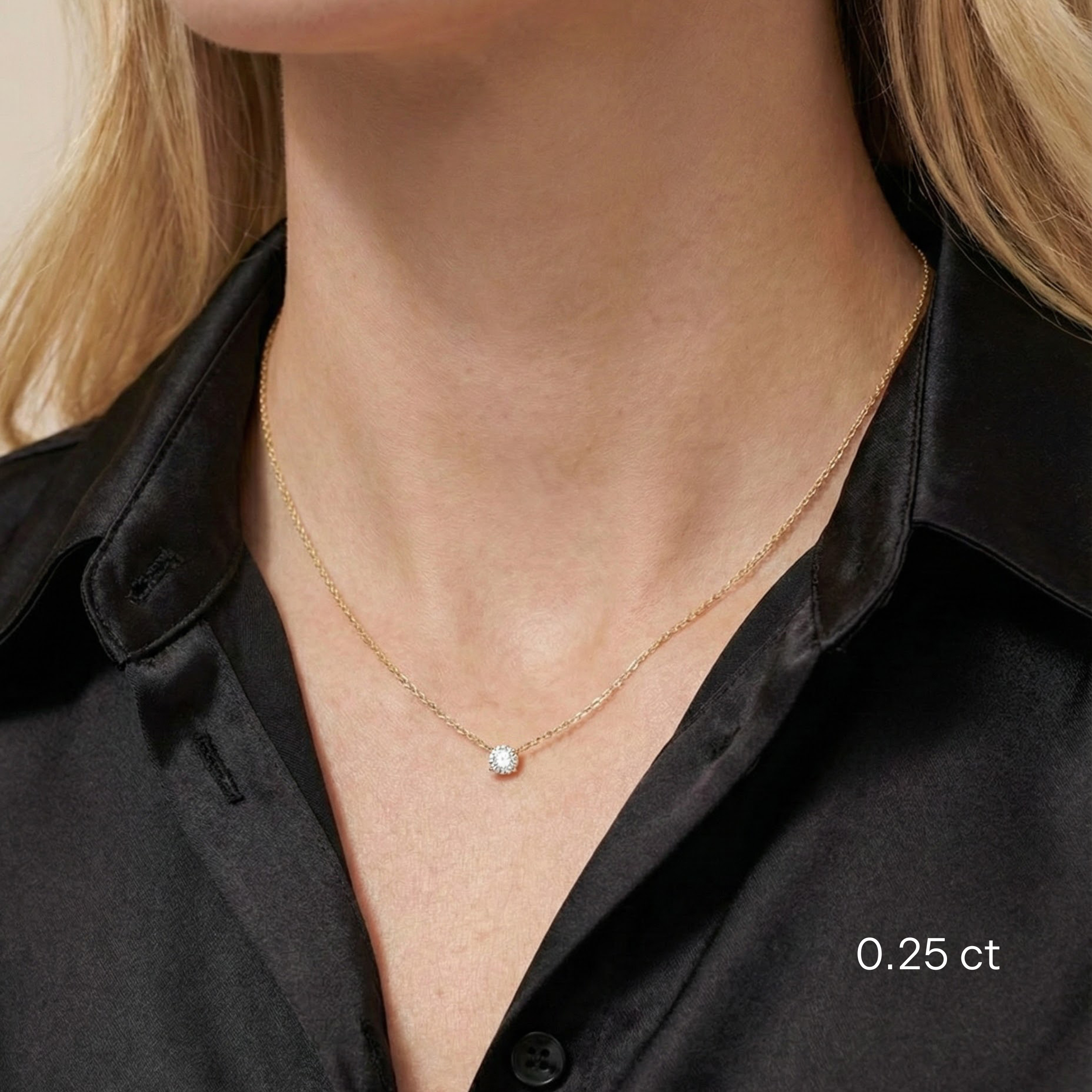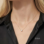 The Solstice Necklace catches light the way water does: fluid, shifting, alive. A round brilliant lab-grown diamond floats from a fine 14k gold chain, its low-profile setting designed to disappear so all you see is shimmer — pure reflection and motion.