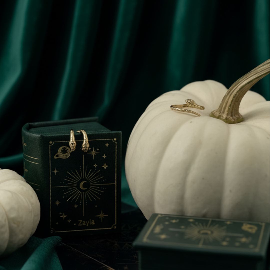 Sleek, sinuous, and a little subversive. This limited bundle pairs our cult-favorite Snake Ring with the Snake Huggies for a double dose of quiet power—made to stack, slink, and turn heads. Ships in our limited-edition Spell Book jewelry box (October only).