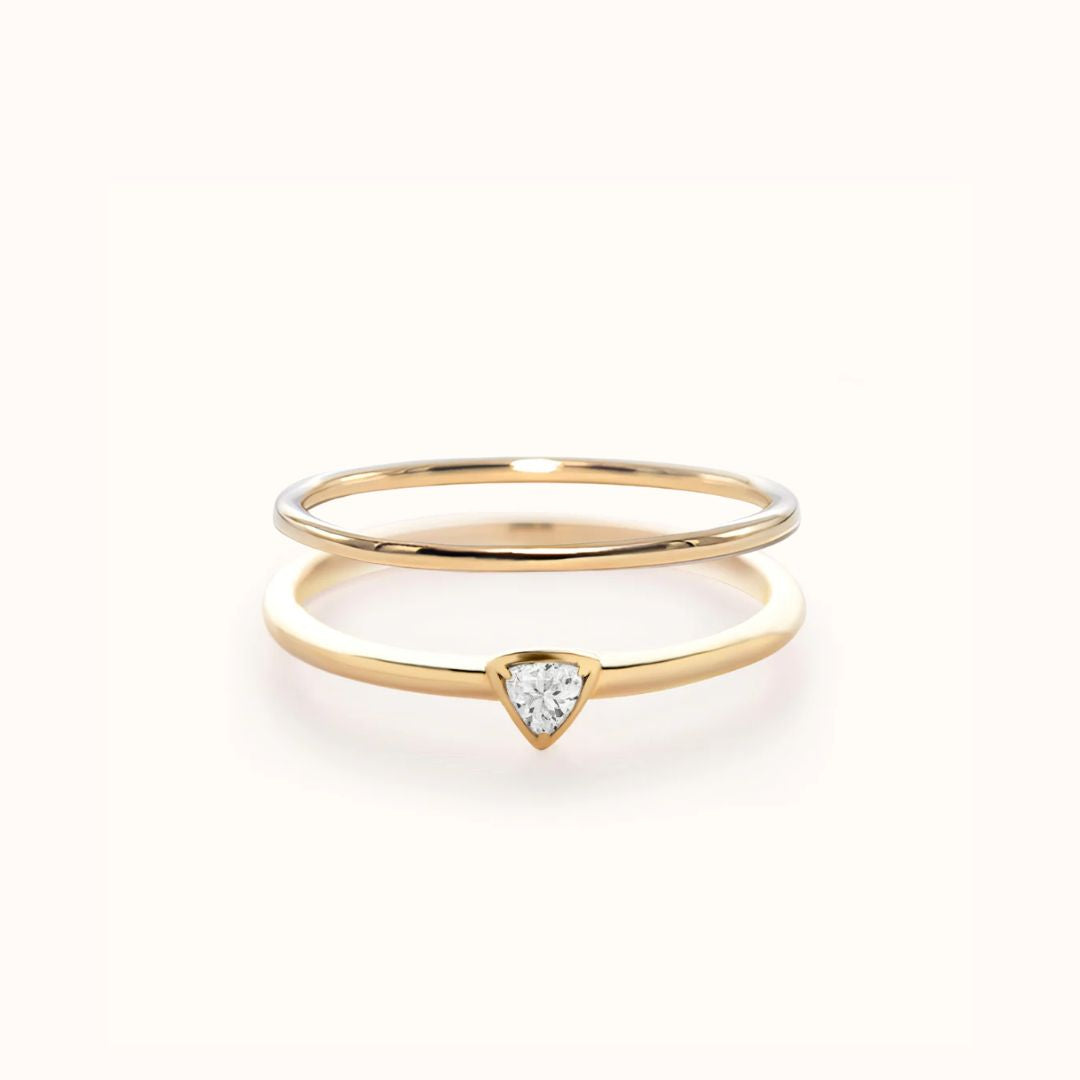 Mini Trillion Stacking Ring — Solid 10k or 14k gold band with a trillion-cut lab-grown diamond in a delicate bezel. CTW ~0.06. Price: $348 for 14k, $278 for 10k.