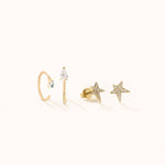 Celestial glow, grounded in gold. The Ether Pair bundles a pair of Supernova Studs with a pair of Diamond Drop Crescents—graphic starbursts plus a soft pear-drop arc for light that moves when you do. Ships in our limited-edition Spellbook jewelry box (October only).