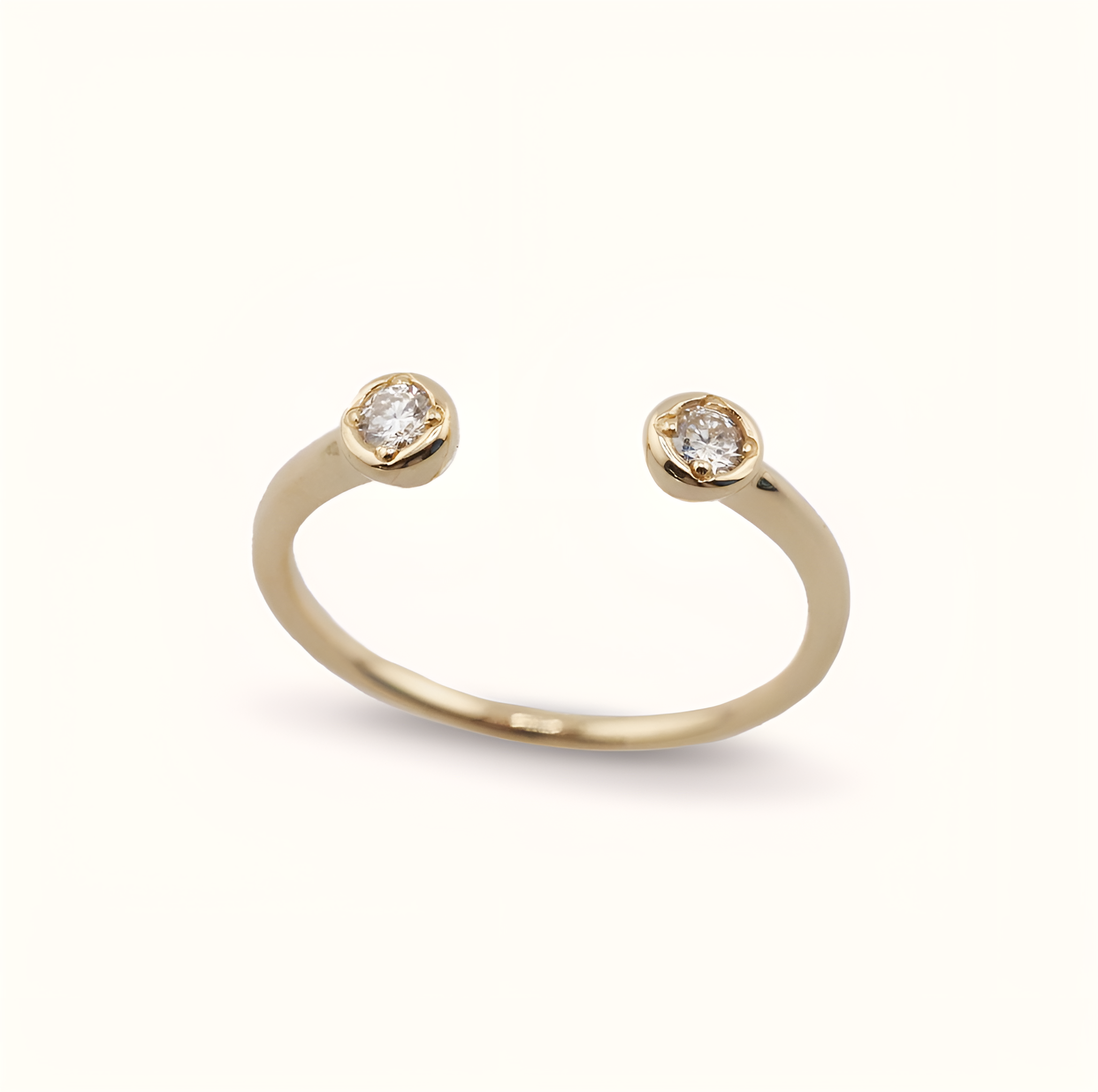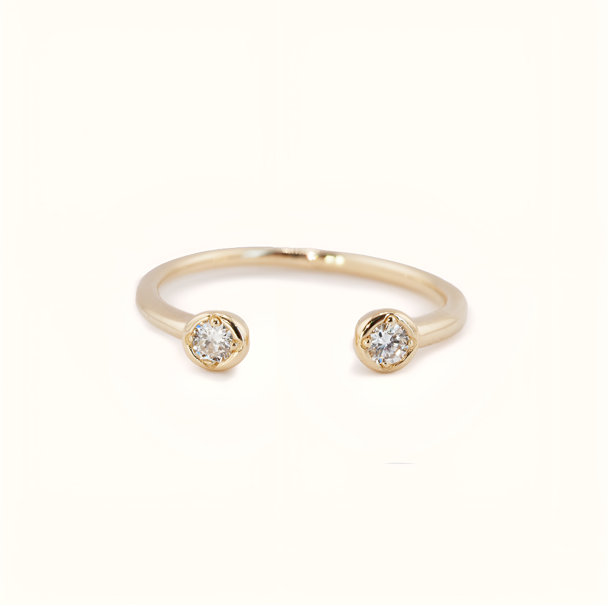 The Open Cuff Ring is where minimalism meets modern elegance. Crafted in 14k solid gold, it features two bezel-set lab-grown diamonds that create a sophisticated yet approachable design. Perfect for stacking or wearing solo, this adjustable ring offers a sleek, understated sparkle for any occasion.