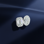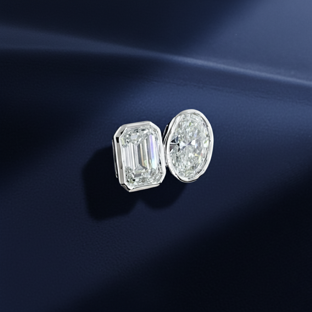 The Duality Studs bring a modern edge to the classic toi et moi silhouette — pairing a sleek emerald-cut diamond with a radiant oval in a mirrored bezel of 14k gold. Together, they create a quiet tension: geometric precision beside organic brilliance.