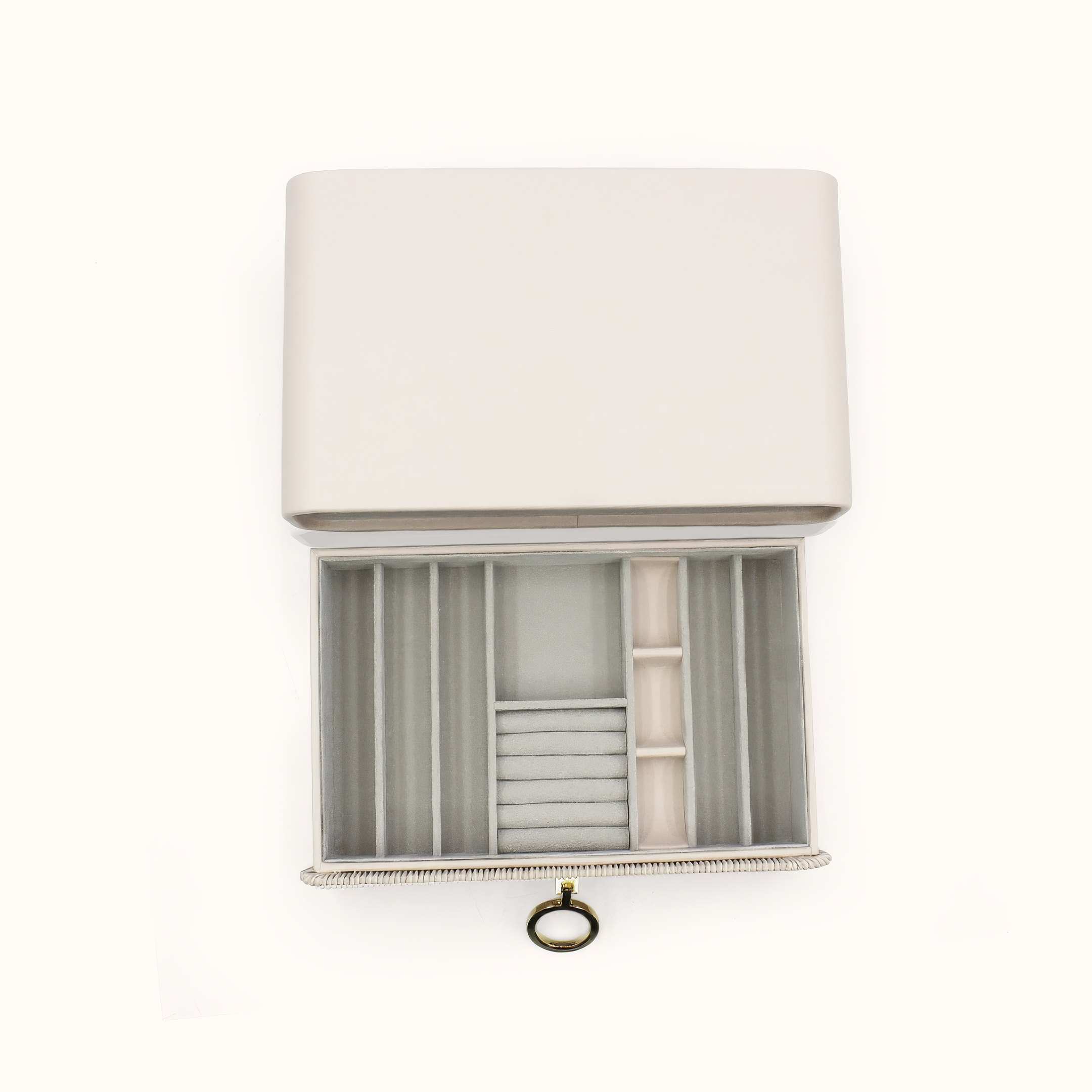 • Intimate interior layout: Soft velvet compartments, ring rolls, earring slots, and modular dividers—each angle considered, each compartment curated for your precious pieces.