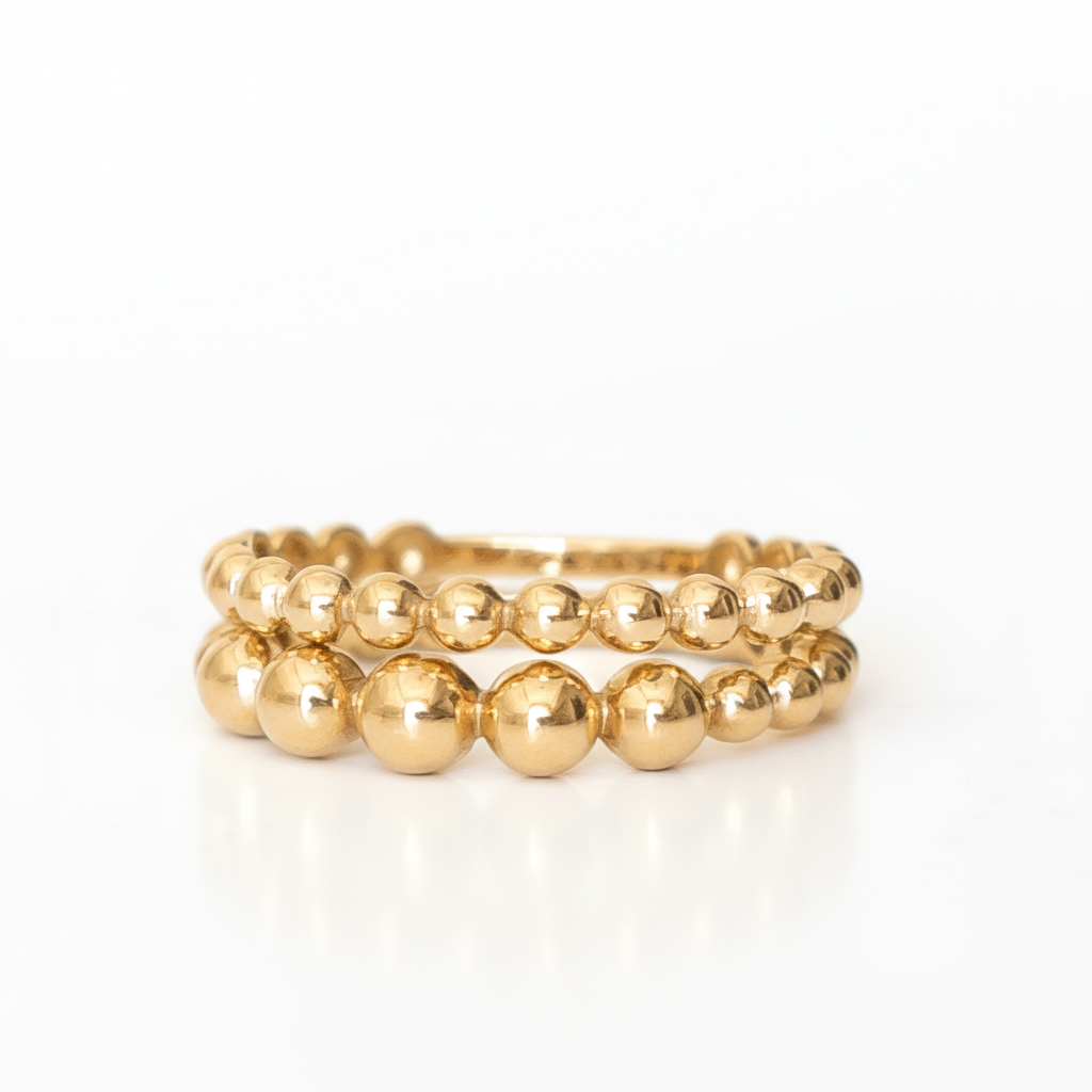Large Bubble Ring — 14k solid gold; playful beaded texture with a slim profile that’s comfortable for daily wear. Band width: 2 mm at widest, 1 mm at narrowest. Price: $228.