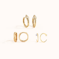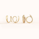 Wear the Snake Huggies in your first lobe for presence, and the Illusion Twists in your second to fake the extra piercing and finish the arc. (Add a slim stud or crescent up top if you’re feeling extra.)