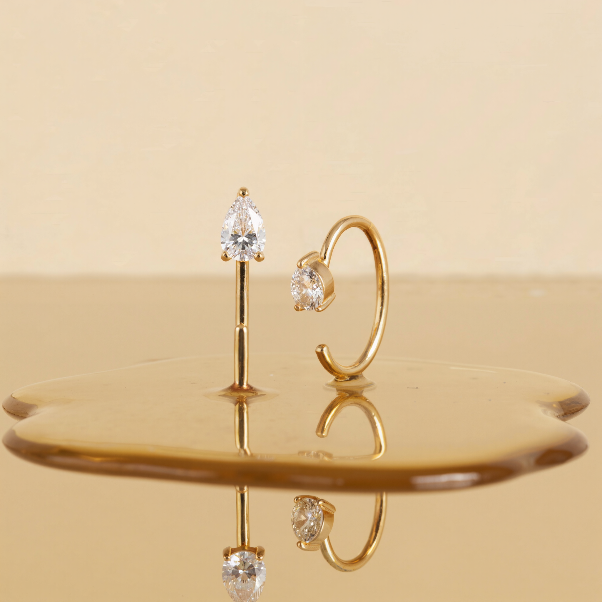 The diamond drop crescents are simple, sophisticated and unique. With a perfectly sized pear cut lab grown diamond and a comfortable curved ring, these beauties offer the look of a cute minimal stud with the "so comfortable you could sleep in it" fit of a flat back earring. Pro tip: pinch the end up a bit to fit your lobe shape perfectly ✨