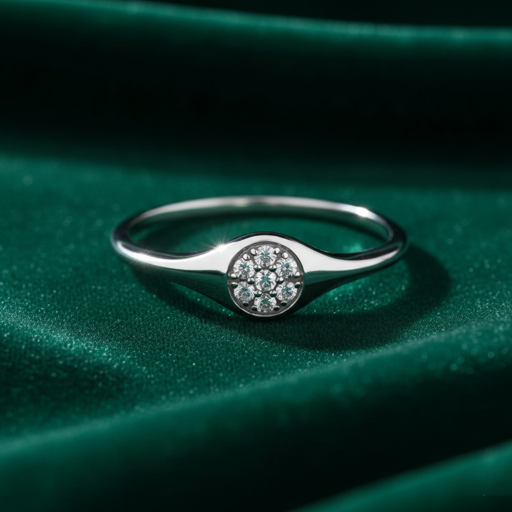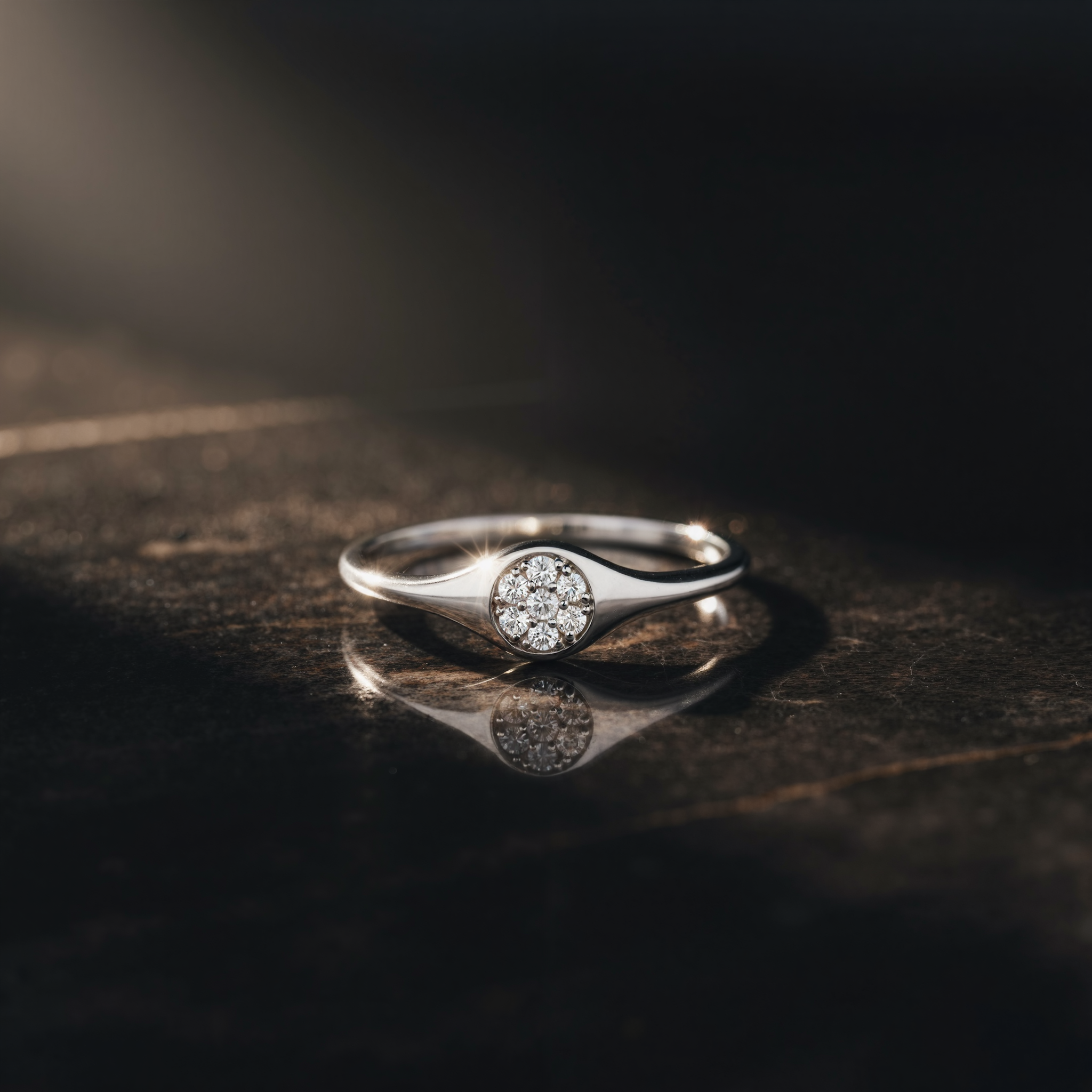 A classic symbol of identity, now dazzlingly redefined. Our round pavé signet ring is your personal emblem, elevated.