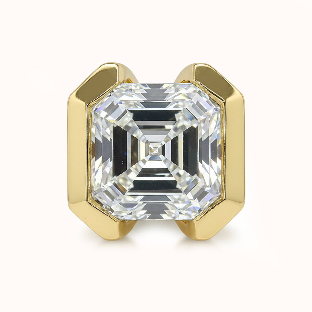• Asscher-cut stones in half-bezel setting for light and dimension