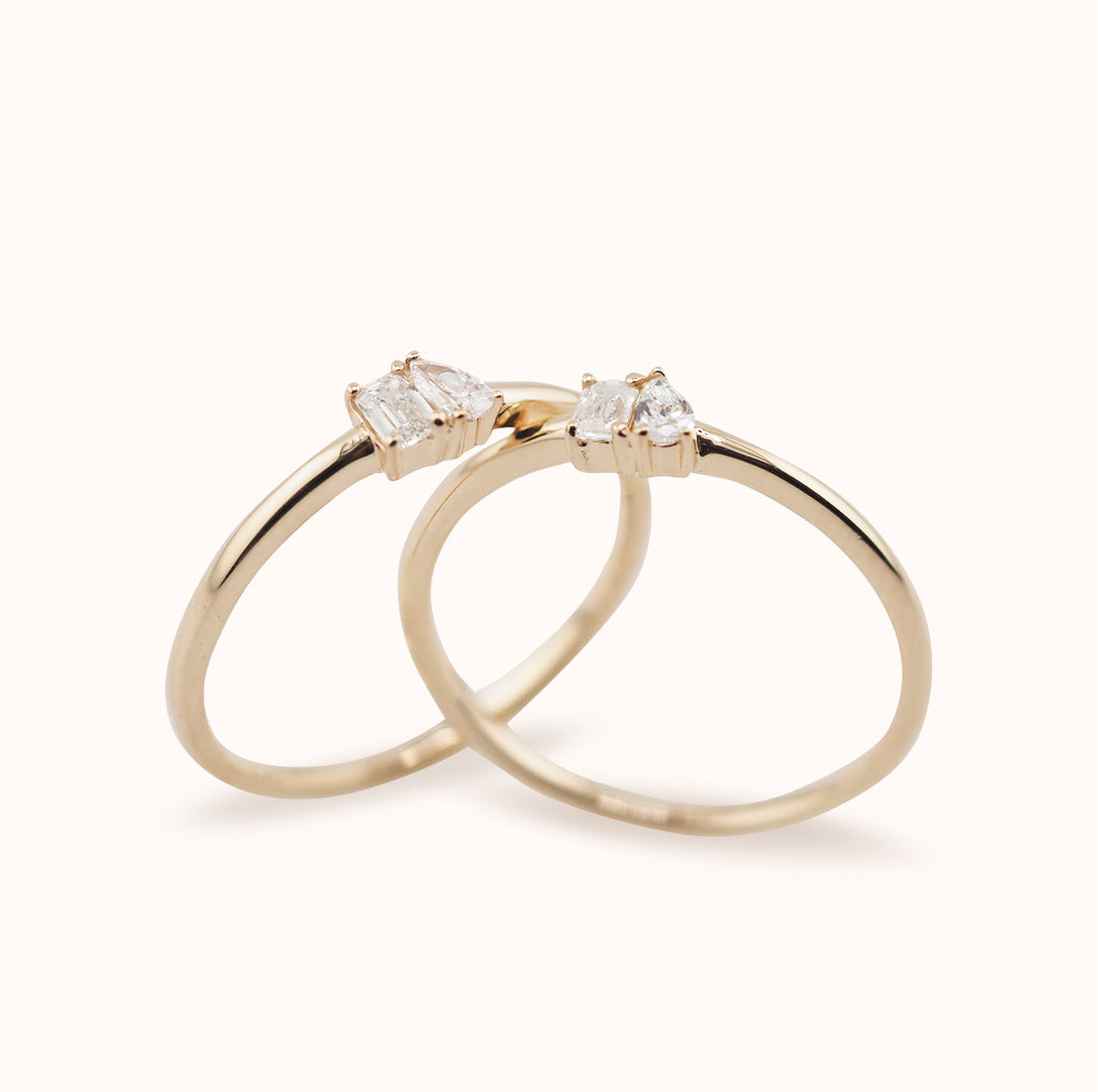 The two diamond design on this ring is so unique and eye-catching. I've only had it for a few weeks but have already gotten so many compliments. I've been pairing it with the trillion diamond stacking ring and love the look of them together.
